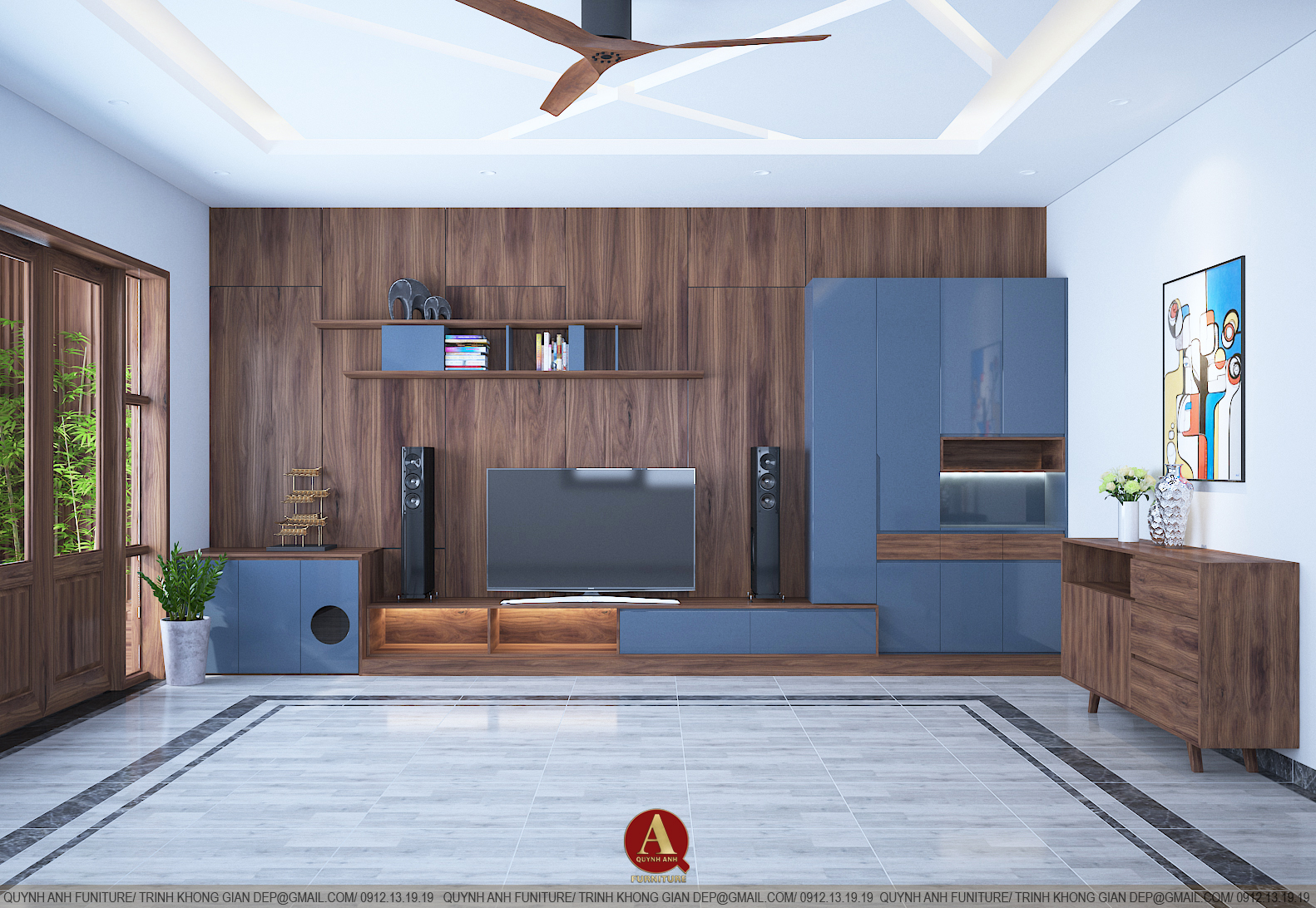 Nội thất Quỳnh Anh đã tư vấn cho gia chủ sử dụng gỗ tự nhiên óc chó làm vật liệu chủ đạo cho nội thất phòng khách + bếp, phòng giải trí, phòng ngủ master và phòng thờ. Riêng phòng ngủ các con sử dụng gỗ công nghiệp với các tông màu tươi sáng thiết kế sinh động, phù hợp với sở thích của trẻ nhỏ.