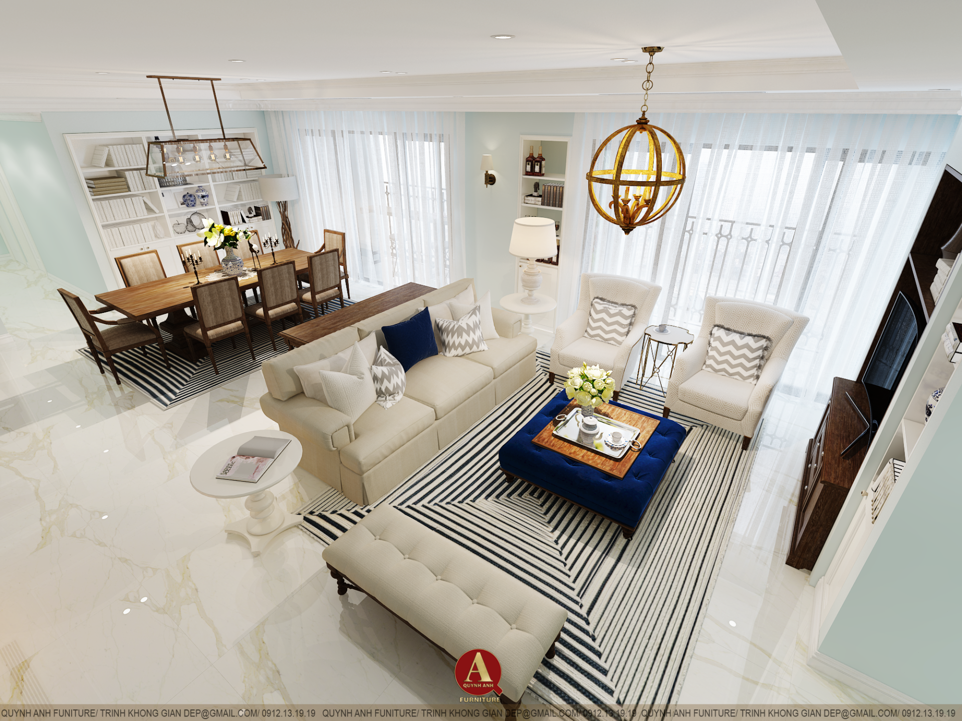 Mỗi góc trong căn hộ đều cho thấy dấu ấn cá nhân của chủ nhà được thể hiện trong từng vật dụng, món đồ nội thất. Không gian sống của gia đình chị Thảo tại chung cư cao cấp Royal City được trang hoàng bởi nội thất tinh tế, phóng khoáng với phong cách Bắc Âu (Scandinavian). Phong cách này với đặc trưng đề cao sự thanh lịch, thẩm mỹ và trang nhã, phù hợp với những người yêu thích sự nhẹ nhàng, tối giản. Không gian sống sáng bừng tinh khôi với tông màu trắng chủ đạo. Nội thất thiết kế với màu đơn sắc, gam màu trắng - xanh mang nét đẹp pha trộn giữa cổ điển và hiện đại. Căn hộ chung cư tạo cảm giác ấm cúng, thoải mái.